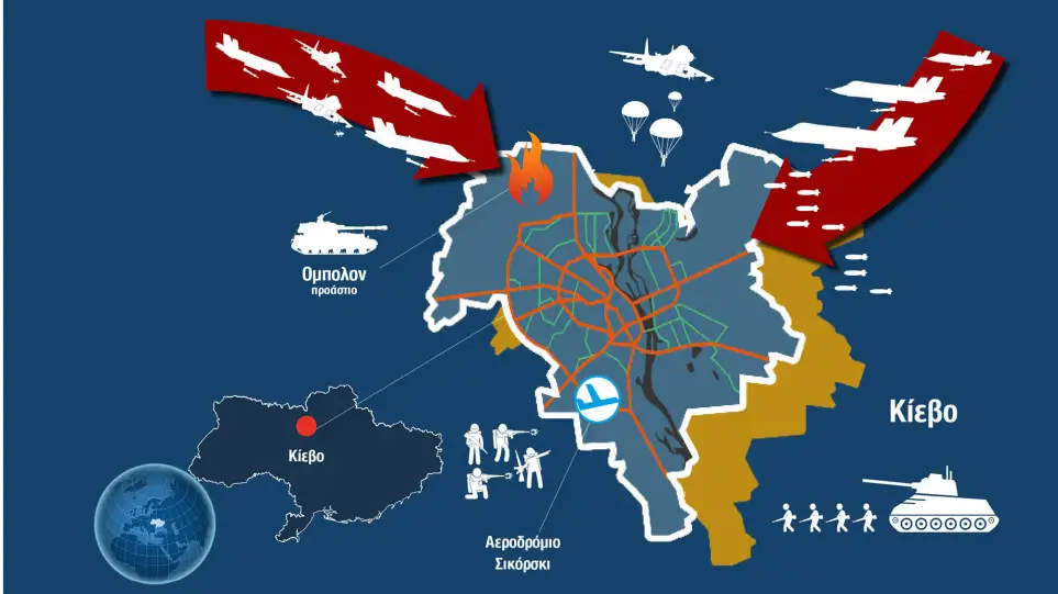 Εν τω μεταξύ από δύο σήμεια πολιορκούν την ουκρανική πρωτεύουσα οι ρωσικές δυνάμεις. Όπως φαίνεται και στον χάρτη που δημοσίευσε το BBC, οι δυνάμεις της Ρωσίας έκαναν επίθεση από δύο πλευρές, από τον βορρά και από τη βορειοανατολική πλευρά του Κιέβου. Πολλά ρωσικά στρατεύματα και τεθωρακισμένα κατευθύνονταν προς την πρωτεύουσα από το Κονοτόπ, στα ανατολικά, έχοντας παρακάμψει την πόλη Τσέρνιγκοφ όπου συνάντησαν ισχυρή αντίσταση από τους Ουκρανούς.