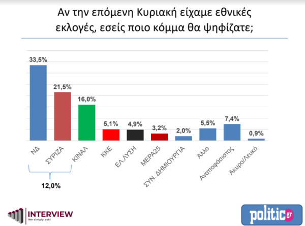 Σύμφωνα με τα ευρήματα της μεγάλης δημοσκόπησης, η ΝΔ εμφανίζει μια μικρή άνοδο στο 33,5% από 33%, ενώ ο ΣΥΡΙΖΑ πέφτει από το 21,8% στο 21,5%. Την έκπληξη κάνει το ΚΙΝΑΛ το οποίο αγγίζει το 16% (από 14,6%) ενώ το ΚΚΕ βρίσκεται στο 5,1%. Η Ελληνική Λύση στο 4,9% και το ΜέΡα 25 στο 3.2%.