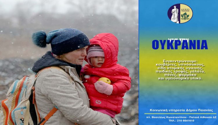 O Δήμος Παιανίας δείχνει την αλληλεγγύη του στον δοκιμαζόμενο λαό της Ουκρανίας που βιώνει τον πόλεμο. Συγκεντρώνουμε: κουβέρτες, υπνόσακους, είδη ατομικής υγιεινής, παιδικές τροφές, γάλατα, πάνες, φάρμακα και υγειονομικό υλικό.