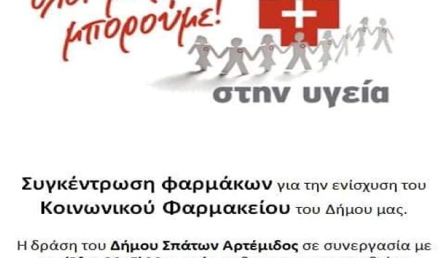 Ο Δήμος Σπάτων-Αρτέμιδος σε συνεργασία με το πρόγραμμα «Όλοι Μαζί Μπορούμε» συγκεντρώνουν φάρμακα για την ενίσχυση του Κοινωνικού Φαρμακείου του Δήμου. Η δράση θα πραγματοποιηθεί το Σάββατο 19 Μαρτίου στα Δημοτικά Ιατρεία της Αρτέμιδος 10.00-14.00.