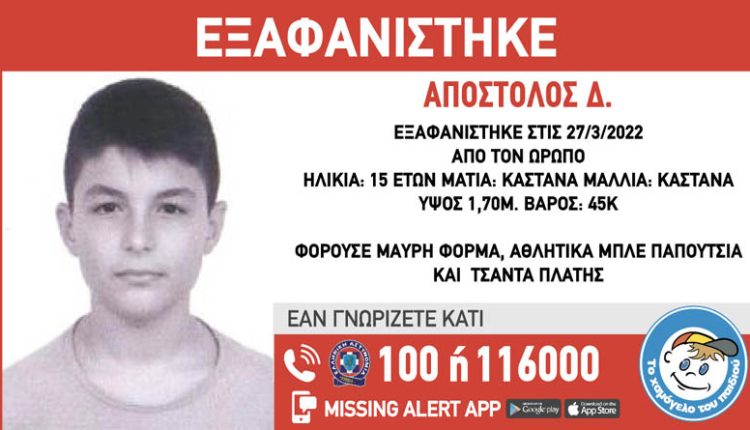 Ωρωπός: Στις 27/03/22, κατά τις απογευματινές ώρες, εξαφανίστηκε από την περιοχή του Ωρωπού, ο Απόστολος Δ. 15 ετών. «Το Χαμόγελο Του Παιδιού» προέβη σήμερα 28/3/2022 στην δημοσιοποίηση των στοιχείων της κατόπιν αιτήματος της οικογένειας του καθώς, υπάρχουν λόγοι που θέτουν την ζωή του σε κίνδυνο.