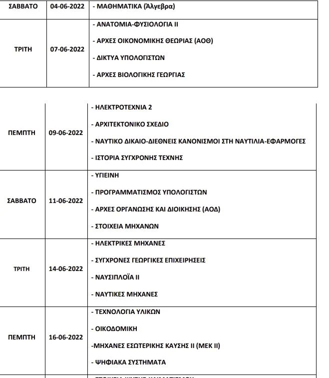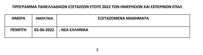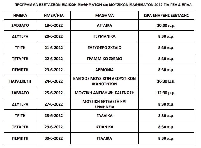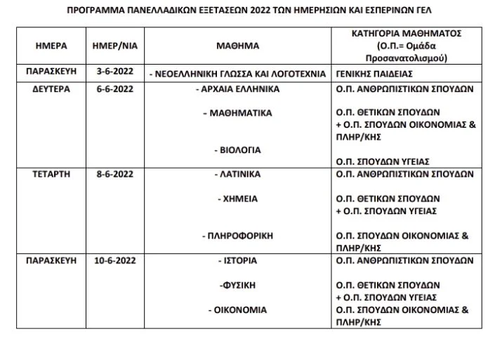 – το πρόγραμμα των πανελλαδικών εξετάσεων Γενικών Λυκείων, Επαγγελματικών Λυκείων και Ειδικών Μαθημάτων έτους 2022.