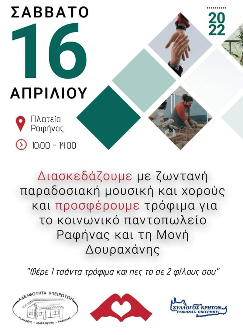 Ο Σύλλογος Κρητών Ραφήνας – Πικερμίου μαζί με την Αδελφότητα Ηπειρωτών Νέας Μάκρης, Μαραθώνα, Ραφήνας- Πικερμίου σας καλούν το Σάββατο στις 16/4 στην πλατεία Ραφήνας 10:00-14:00 να προσφέρουμε τρόφιμα για τους συνανθρώπους μας.