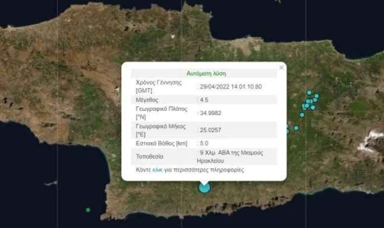 Πιο συγκεκριμένα, σύμφωνα με την αυτόματη λύση του Γεωδυναμικού Ινστιτούτου, ο σεισμός ήταν 4,5 Ρίχτερ, με επίκεντρο 9χλμ. ανατολικά και βορειανατολικά της Μιαμούς Ηρακλείου.