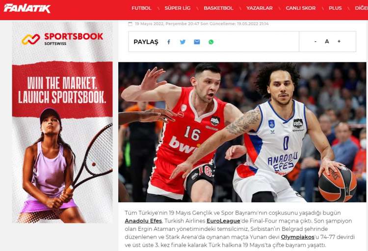 Ο εκπρόσωπός μας, Εργκίν Αταμάν κέρδισε τον Έλληνα γίγαντα Ολυμπιακό με 77-74 στον αγώνα που διεξήχθη στο Βελιγράδι. Η Εφές πέρασε στον τελικό για τρίτη συνεχόμενη χρονιά, δίνοντας στον τουρκικό λαό διπλό γλέντι στις 19 Μάη».