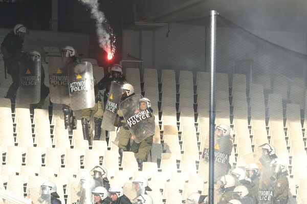 Οι οπαδοί των δύο ομάδων έβαλαν ως στόχο τους αστυνομικούς. Πέταξαν διάφορα αντικείμενα προς το μέρους τους, για να απαντήσουν αυτοί με χημικά και χειροβομβίδες κρότου λάμψης ώστε να μην ξεφύγει η κατάσταση. Η ατμόσφαιρα, πάντως, έγινε αποπνικτική, με την ένταση να έχει να κάνει με τους οπαδούς και των δύο ομάδων αλλά κυρίως αυτών του Παναθηναϊκού και την αστυνομία.