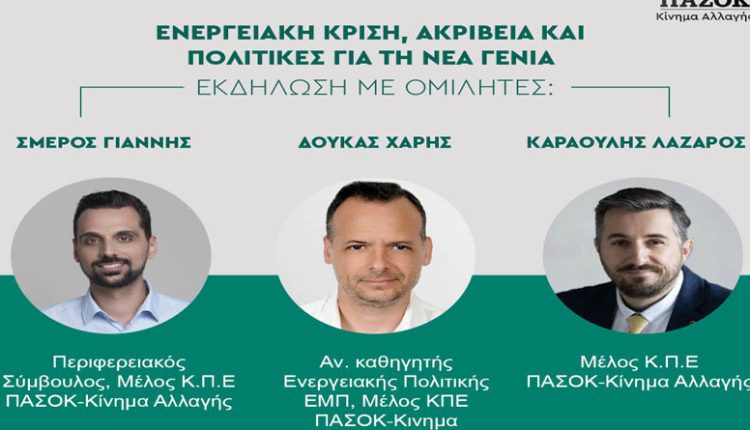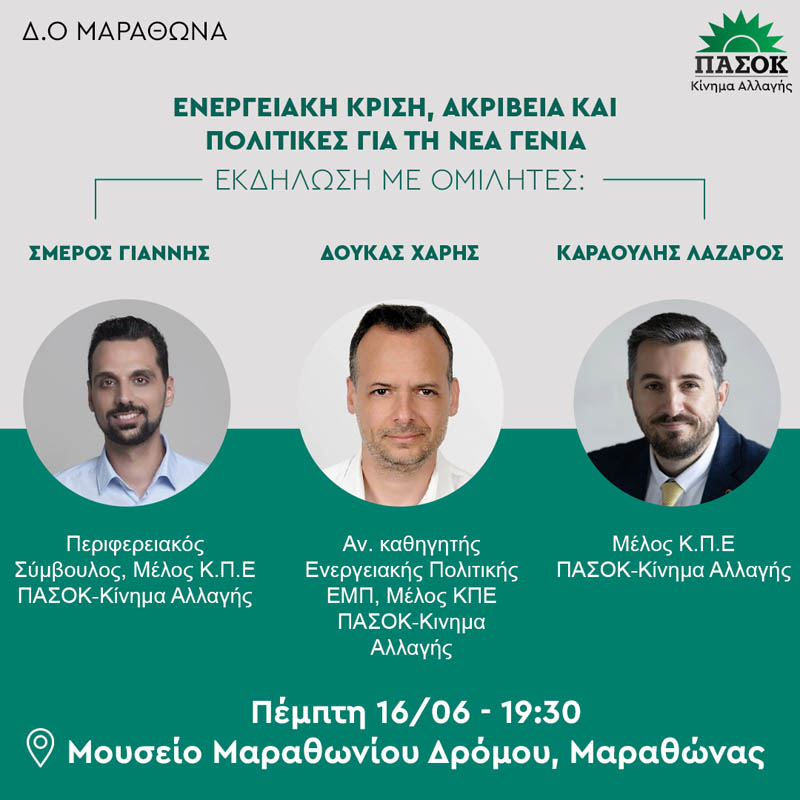 Η Δ.Ο. ΠΑΣΟΚ Κίνημα Αλλαγής Μαραθώνα – Νέας Μάκρης σας προσκαλεί την Πέμπτη 16 Ιουνίου και ώρα 19:30 στο Μουσείο Μαραθωνίου δρόμου σε εκδήλωση με θέμα: “Ενεργειακή κρίση, ακρίβεια και πολιτικές για την νέα γενιά”, με ομιλητές τα μέλη της Κ.Π.Ε. Χάρη Δούκα, Αν. καθηγητή Ενεργειακής πολιτικής ΕΜΠ, Γιάννη Σμέρο, περιφερειακό σύμβουλο Αν. Αττικής και Λάζαρο Καραούλη.