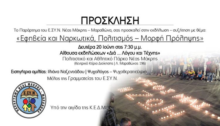 Νέα Μάκρη: Με αφορμή την Παγκόσμια Ημέρα κατά των Ναρκωτικών και την έξαρση του φαινομένου της τοξικοεξάρτησης, το Παράρτημα του Ε.Σ.Υ.Ν Νέας Μάκρης -Μαραθώνα (Εθνικό Συμβούλιο κατά των ναρκωτικών), διοργανώνει εκδήλωση -συζήτηση με θέμα “Εφηβεία και Ναρκωτικά, Πολιτισμός – Μορφή Πρόληψης”
