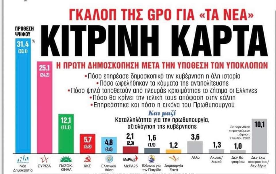 Ειδικότερα, η εφημερίδα «ΤΑ ΝΕΑ Σαββατοκύριακο» δημοσιεύει στο αυριανό της φύλλο δημοσκόπηση της GPO όπου η διαφορά μεταξύ ΝΔ-ΣΥΡΙΖΑ ανέρχεται στις 6,3 μονάδες έναντι 8,9 μονάδων στην προηγούμενη δημοσκόπηση.