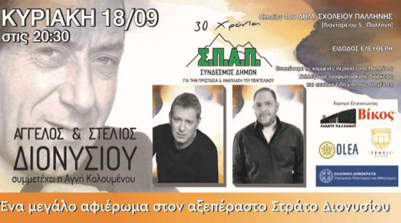 Ο ΣΠΑΠ (Σύνδεσμος Δήμων για την Προστασία και Ανάπλαση του Πεντελικού), γιορτάζοντας τα 30 χρόνια λειτουργίας του, οργανώνει την Κυριακή 18 Σεπτεμβρίου 2022, στις 20:30, στον χώρο πλησίον 4ου Δημοτικού Σχολείου Παλλήνης (Λιονταρείου 5, Παλλήνη), δράση αλληλεγγύης (Πεντελικό, το βουνό της καρδιά μας), σε συνεργασία με τον Δήμο Παλλήνης και με την υποστήριξη του υπουργείου Πολιτισμού και Αθλητισμού, για τις περιοχές Ανθούσα, Γέρακα, Παλλήνη, που επλήγησαν από την πρόσφατη πυρκαγιά της Πεντέλης.