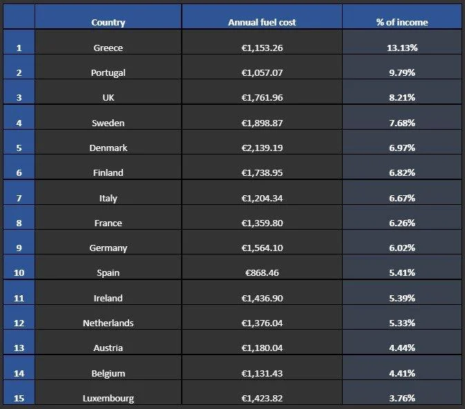 Αυτό προκύπτει από την τελευταία έρευνα της Confused.com (3ο τρίμηνο 2022). Η έρευνα αποκαλύπτει τις ευρωπαϊκές χώρες στις οποίες οι οδηγοί ξοδεύουν το μεγαλύτερο ποσοστό του ετήσιου εισοδήματός τους για καύσιμα. Αυτό υπολογίστηκε αναλύοντας επίσημα στοιχεία για το μέσο ετήσιο εισόδημα κάθε χώρας σε σύγκριση με τη μέση κατανάλωση καυσίμων και τις τιμές καυσίμων ανά λίτρο.